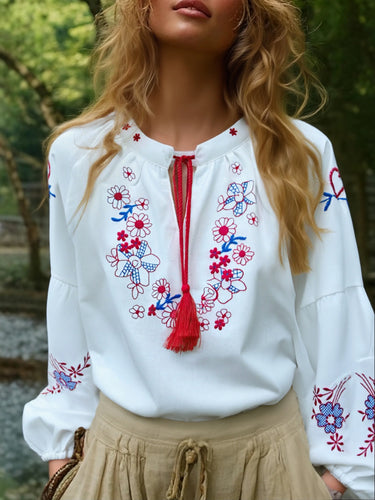 Wild Floral Embroidery ,Linen Cotton Shirts, Lace-up Tassel Boho Blusas