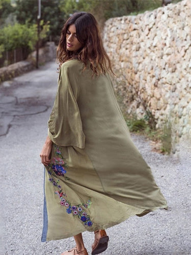 Embroidery Floral Print Kimono, Bohemian Cover-up