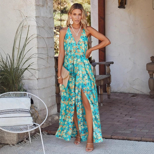 • Wild Floral , Deep V-neck ,Autumn Boho Maxi Dress