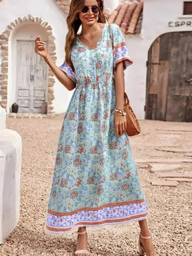 Wild Floral Print ,Short Sleeve Maxi Dress ,Rayon Boho Dress