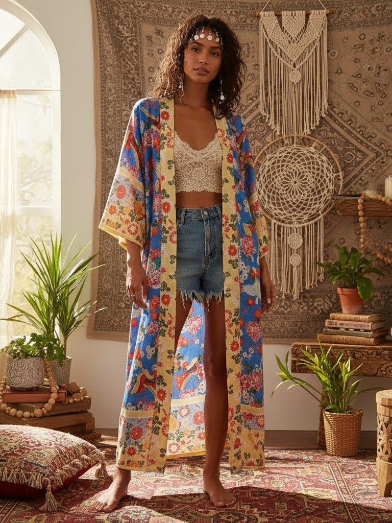 Floral Bird Print , Bohemian Kimono, Boho Maxi Dress Robe – Boho Queens
