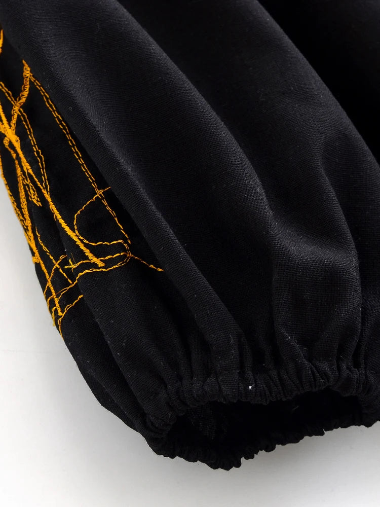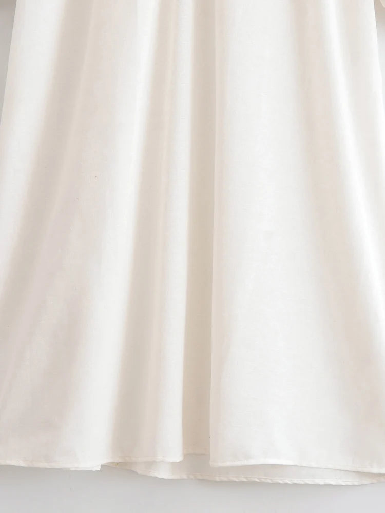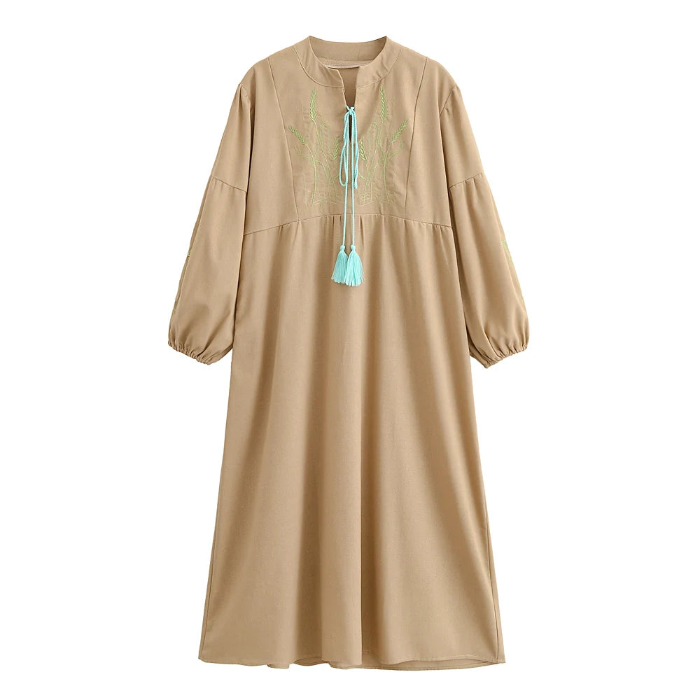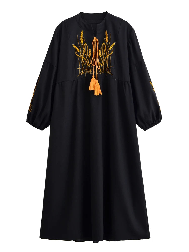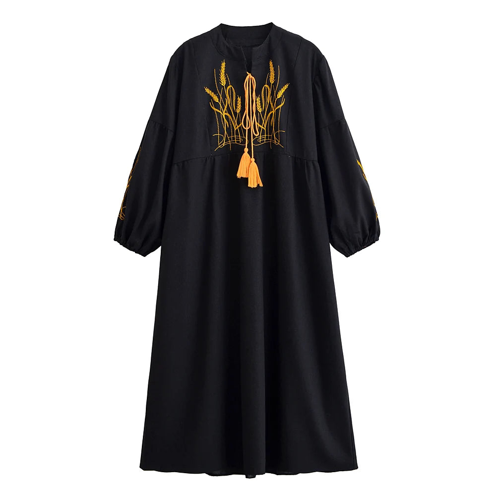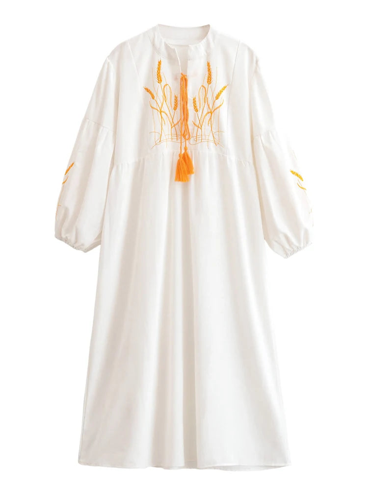 Retro Linen Cotton,Wheat Emberoidery, Lantern Sleeve Boho Maxi Dress – Boho Queens