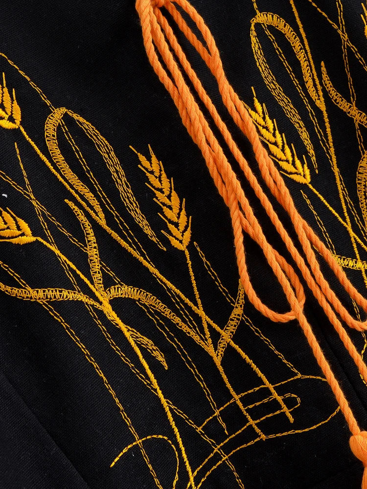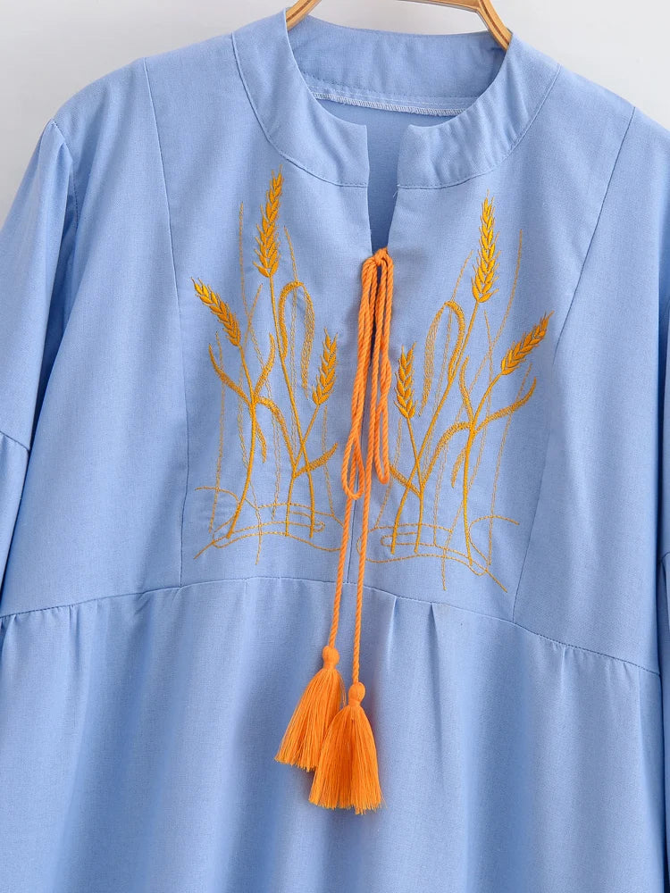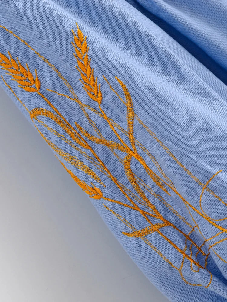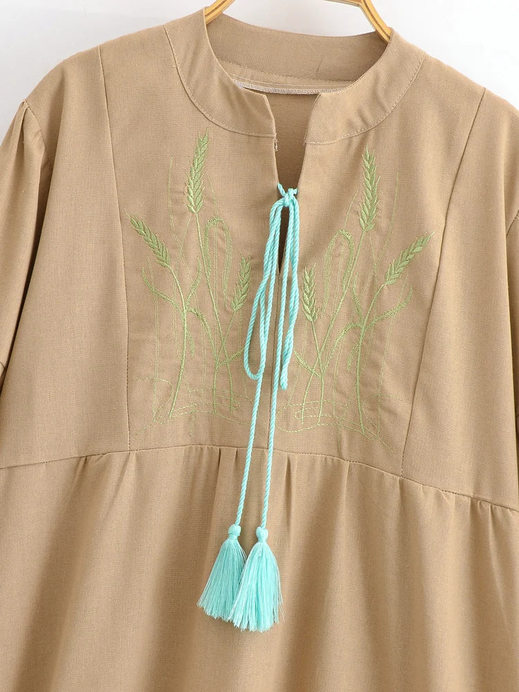 Retro Linen Cotton,Wheat Emberoidery, Lantern Sleeve Boho Maxi Dress
