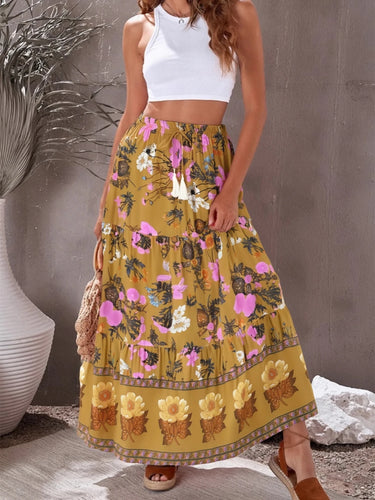 • Yellow Floral Print,,High Elastic, Boho Maxi Skirt