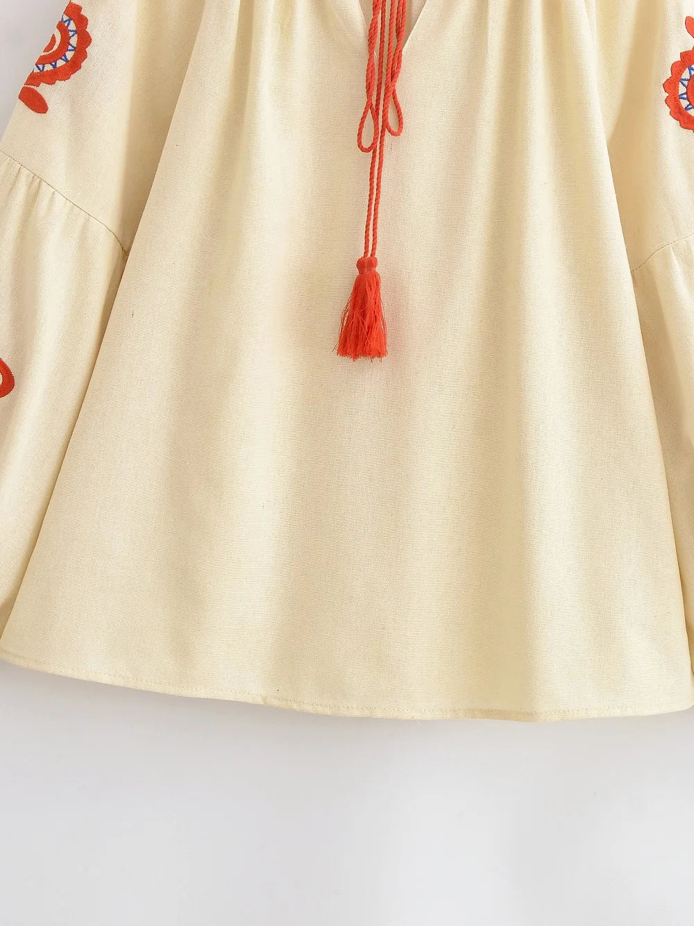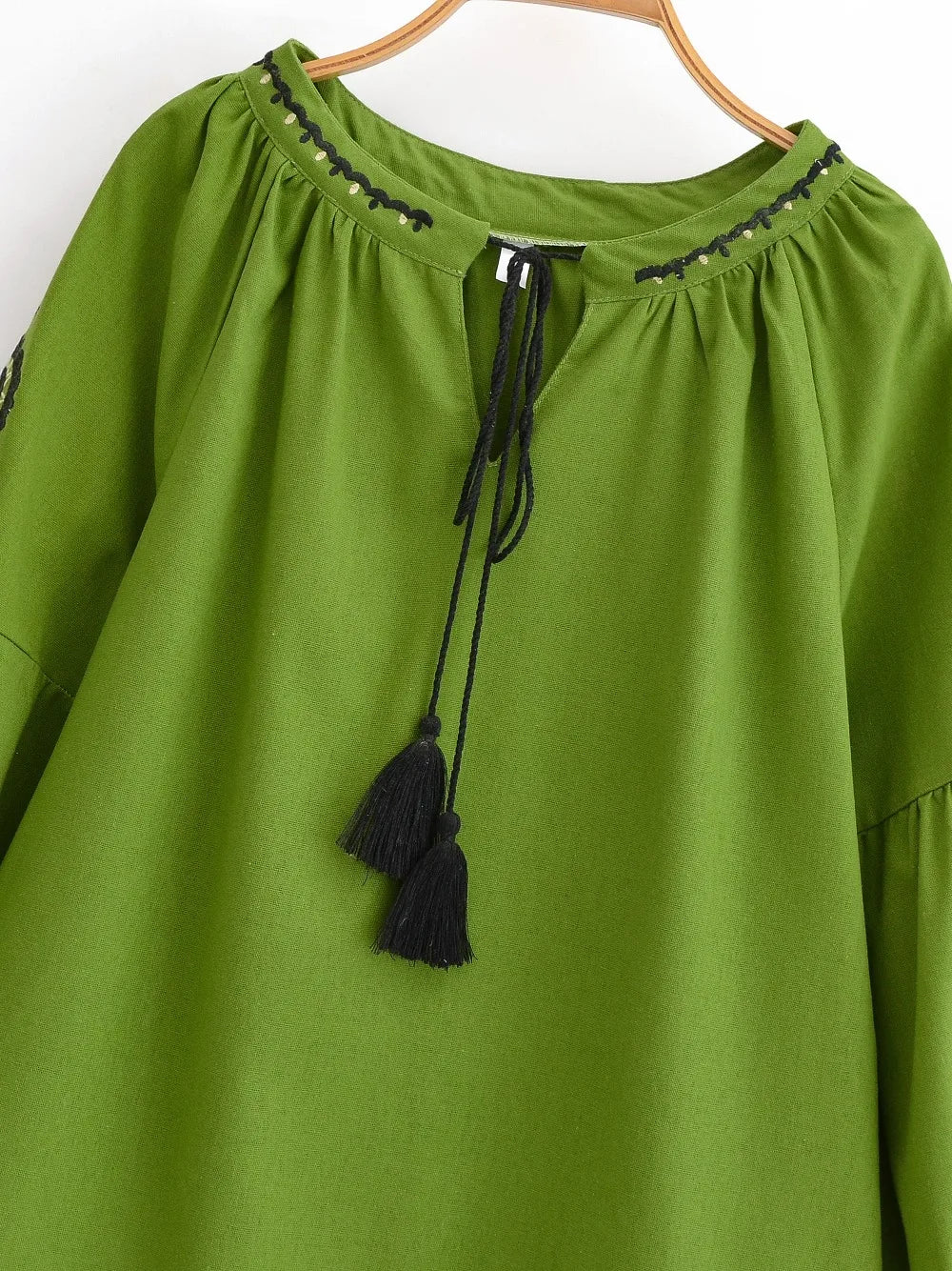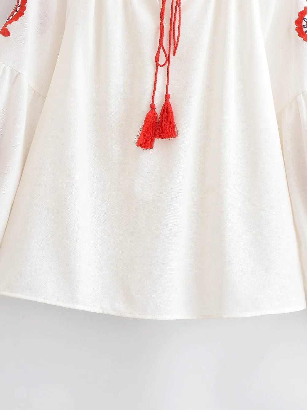 🎀 Tassel Tie V-Neck: The classic peasant-style neckline features playful tassel ties. Wear it tied for a modest look or open for a breezy V-neck style.
