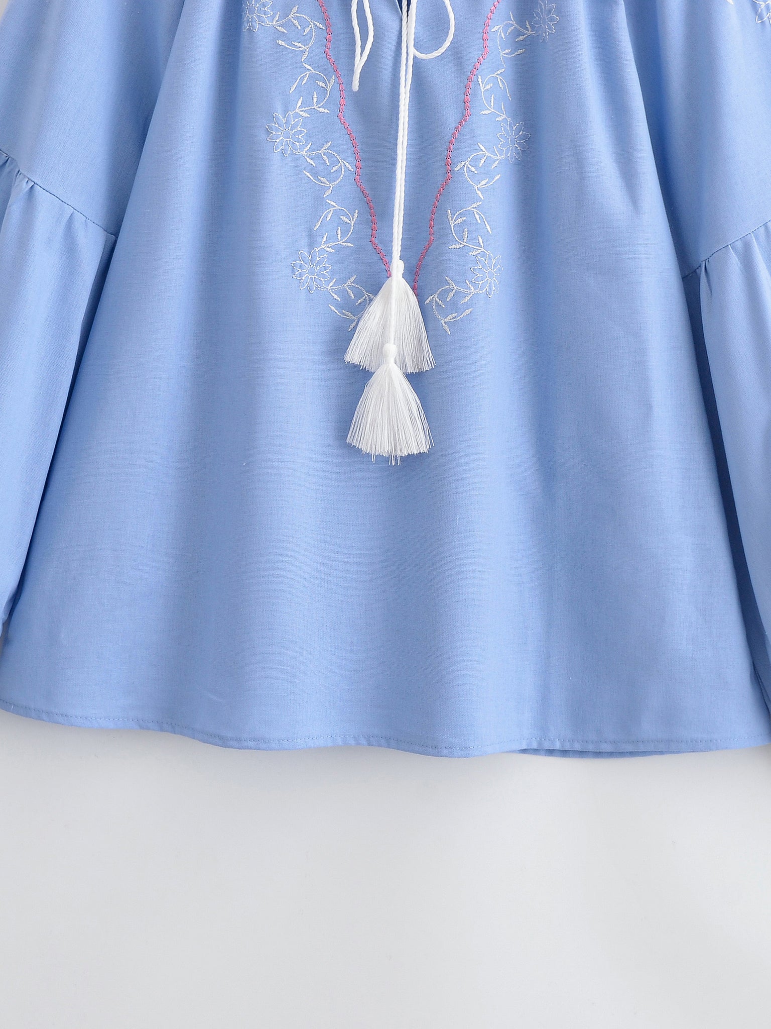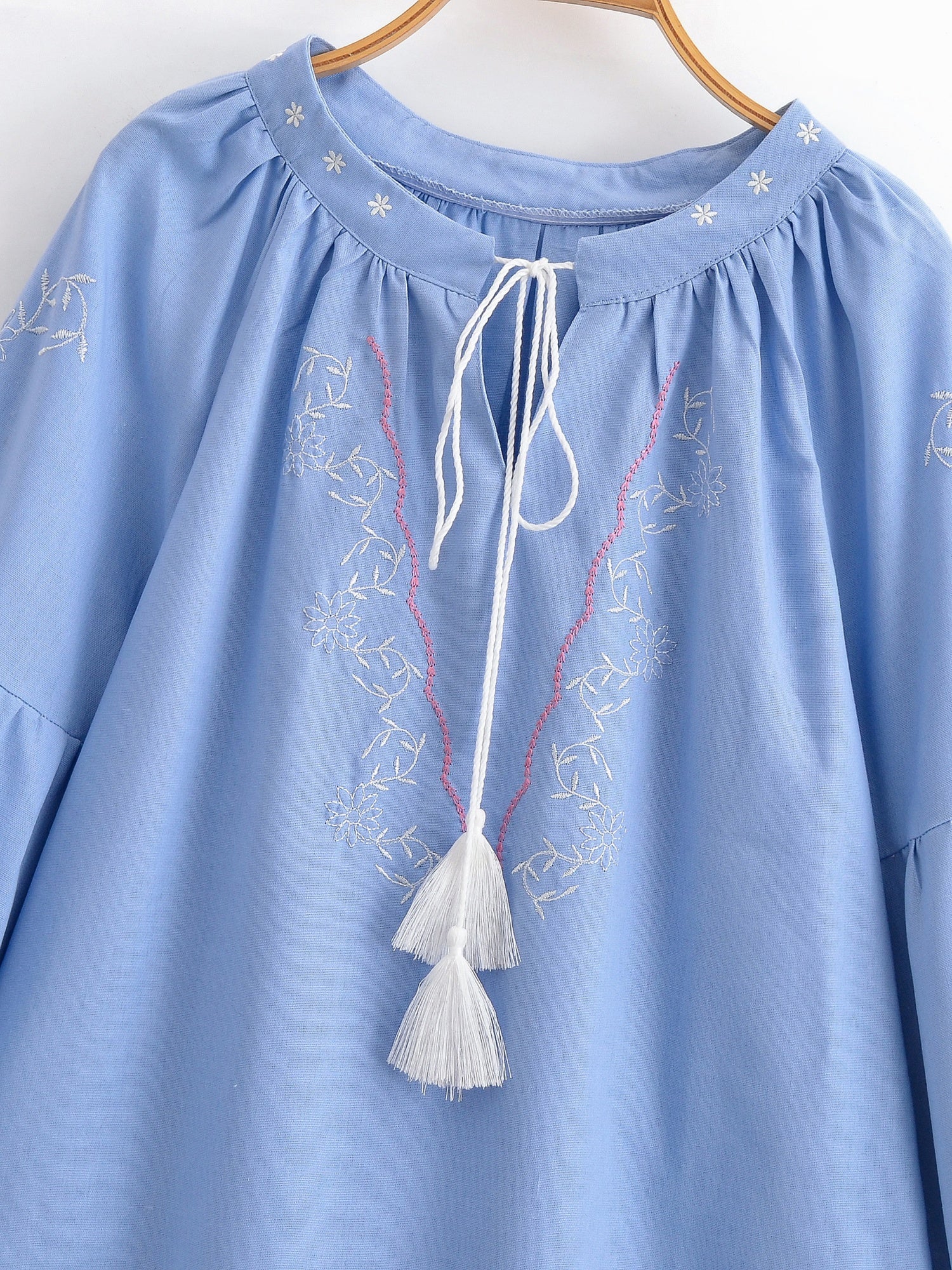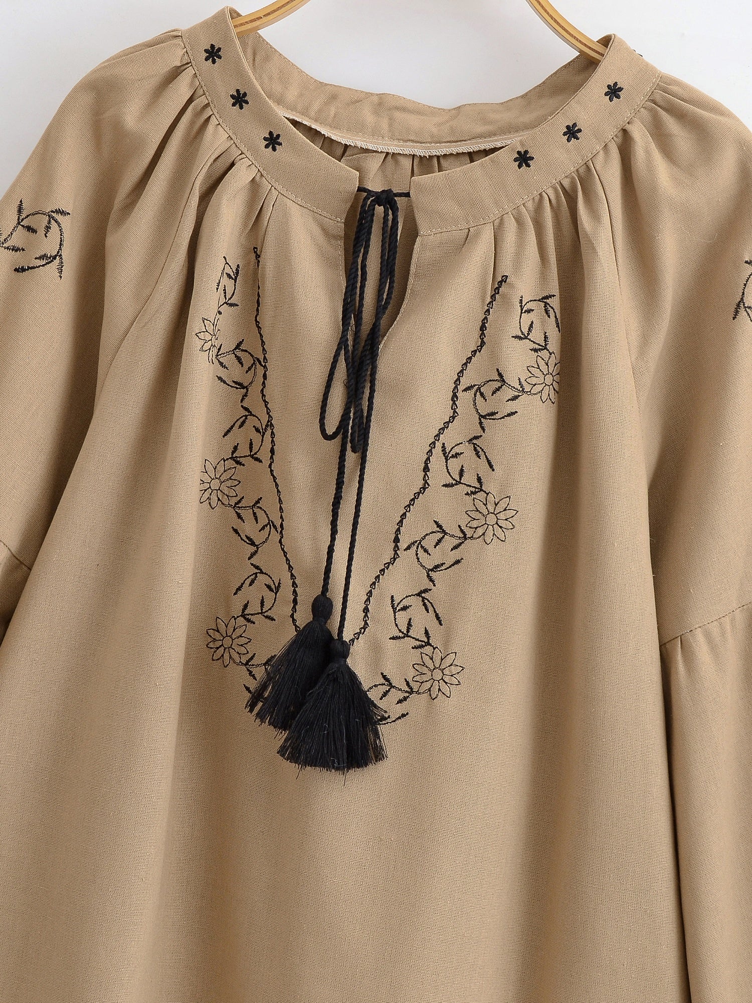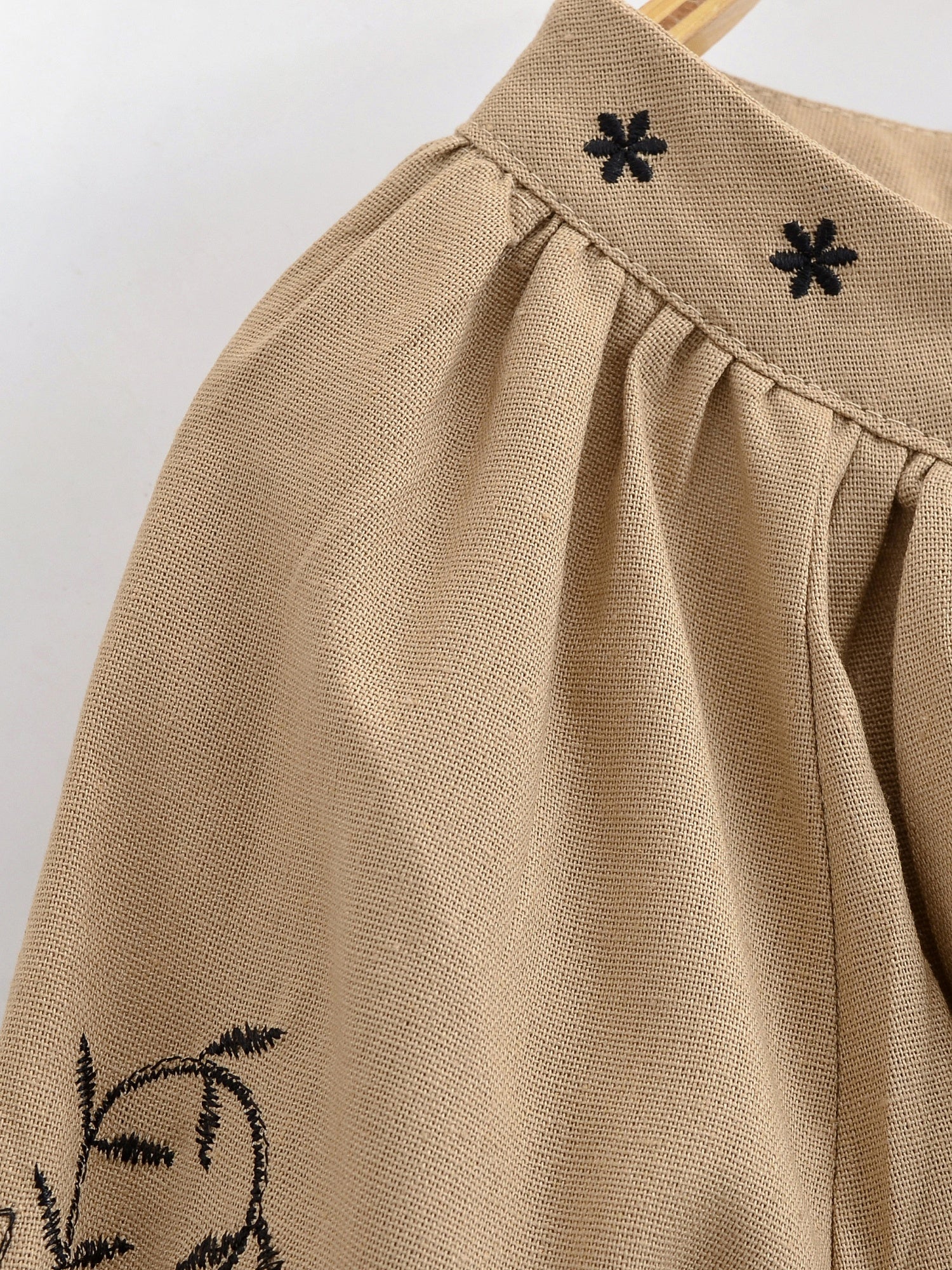 Retro Floral Embroidered, Linen Cotton Blouse ,Lace-up Boho Shirt