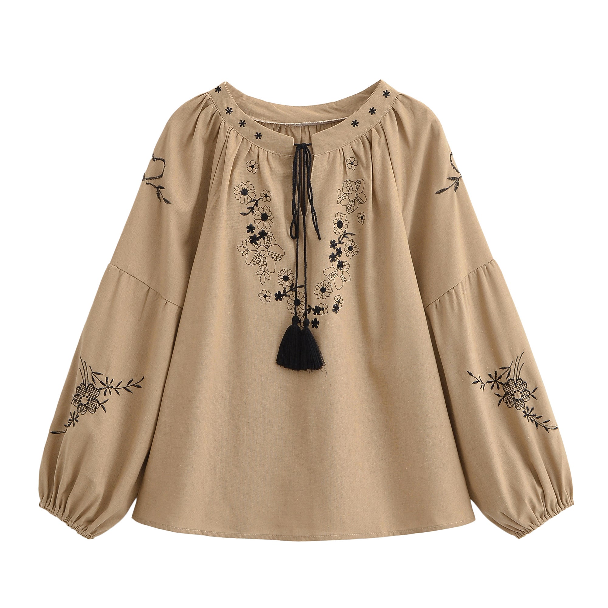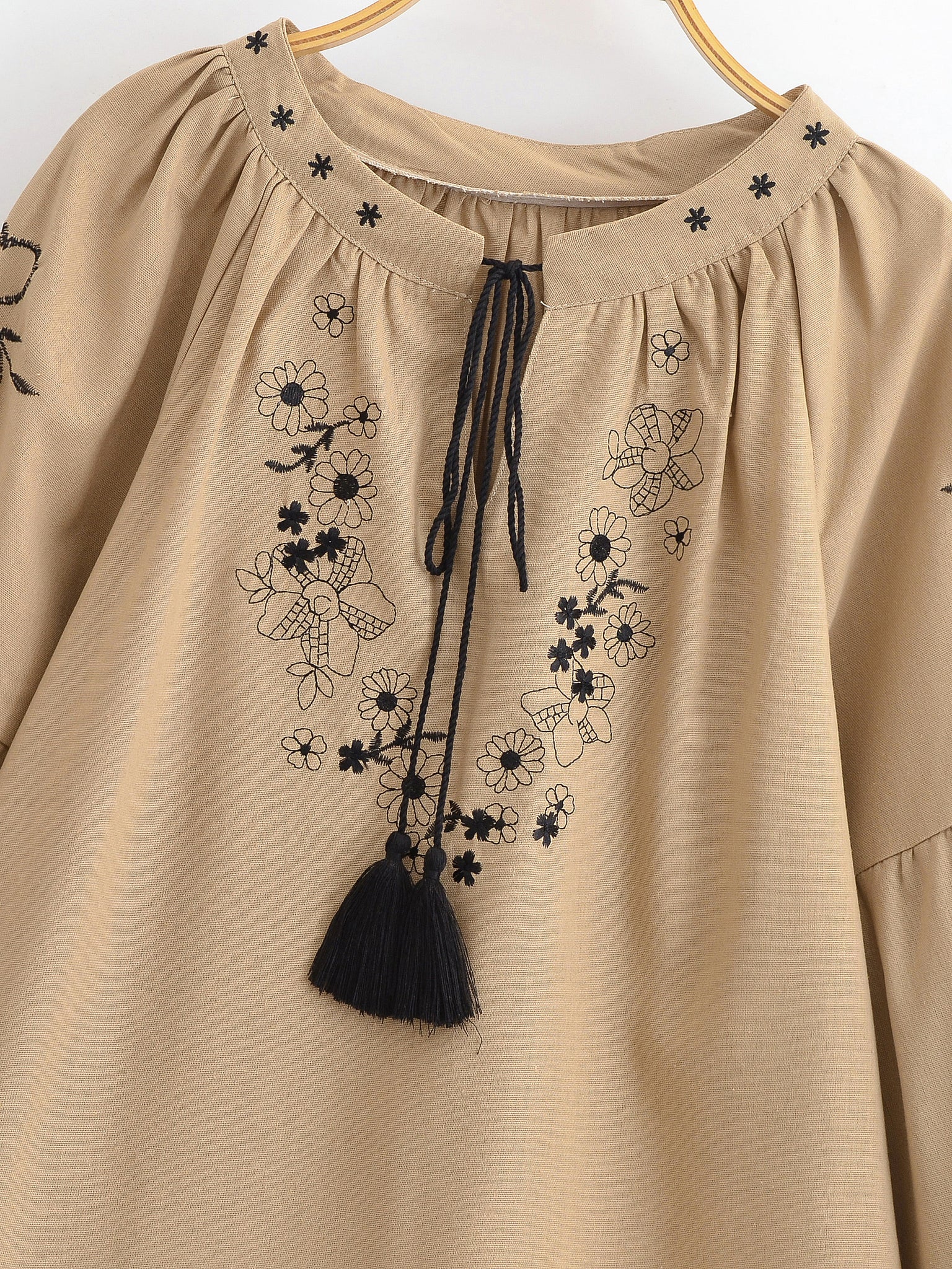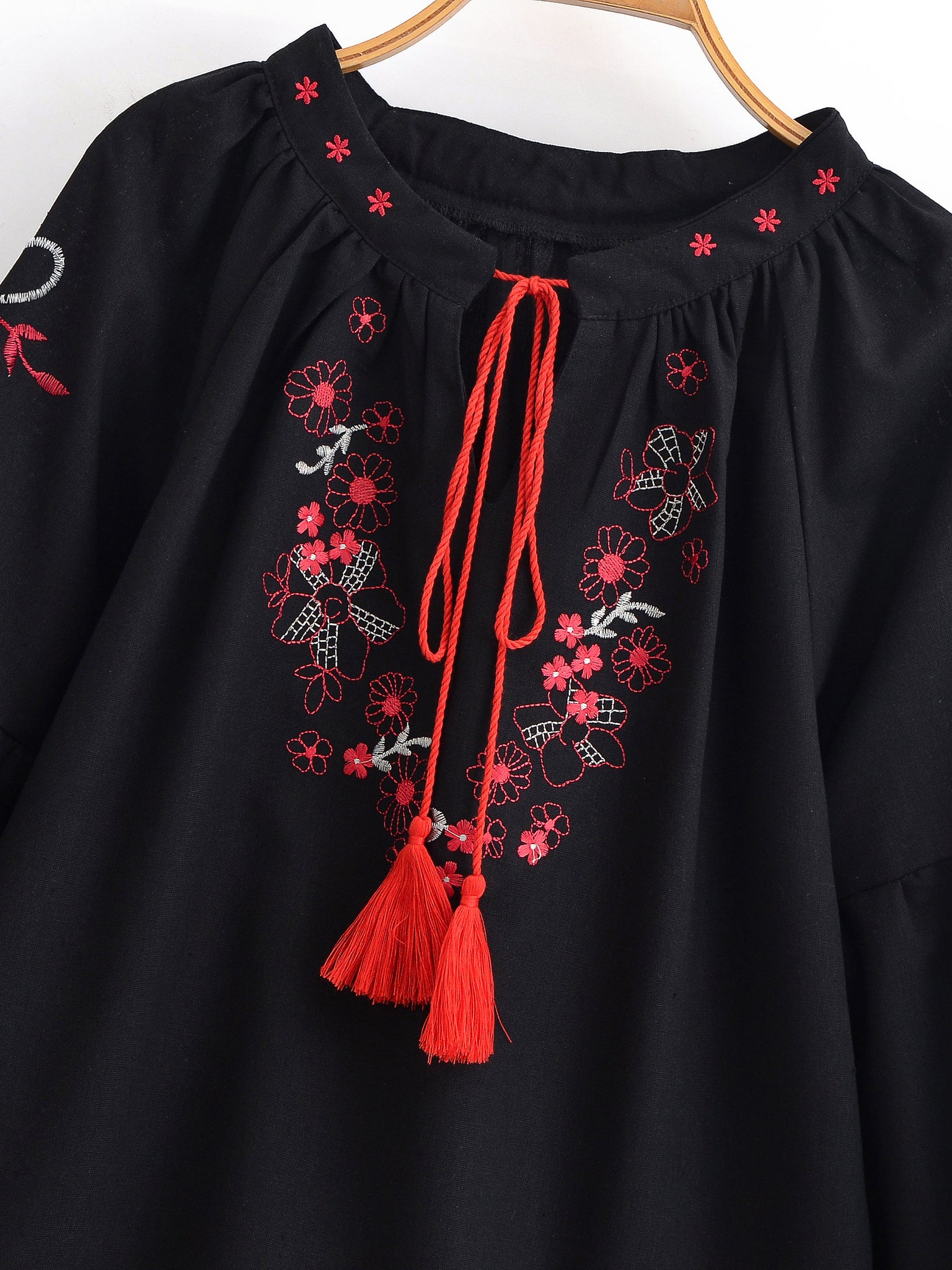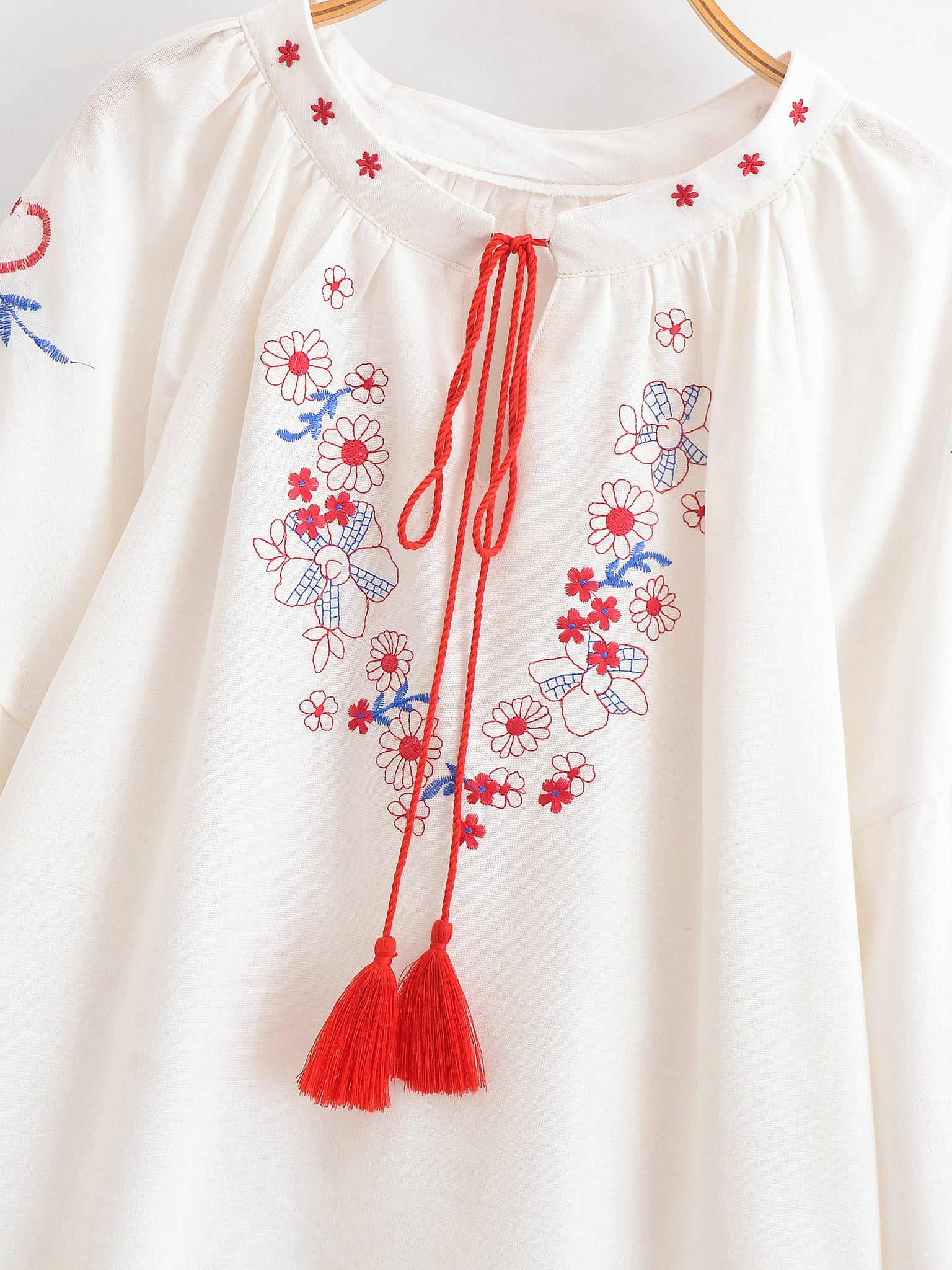Retro Floral Embroidered ,Linen Cotton Blouse ,Lace-up Tassel Boho Shirts