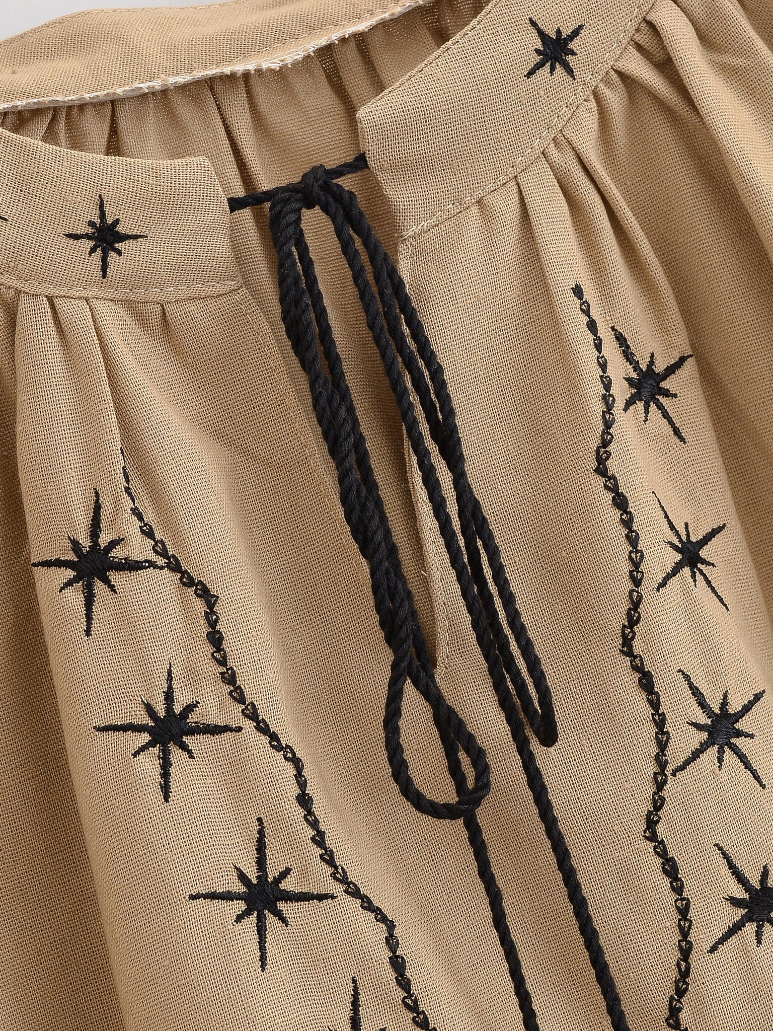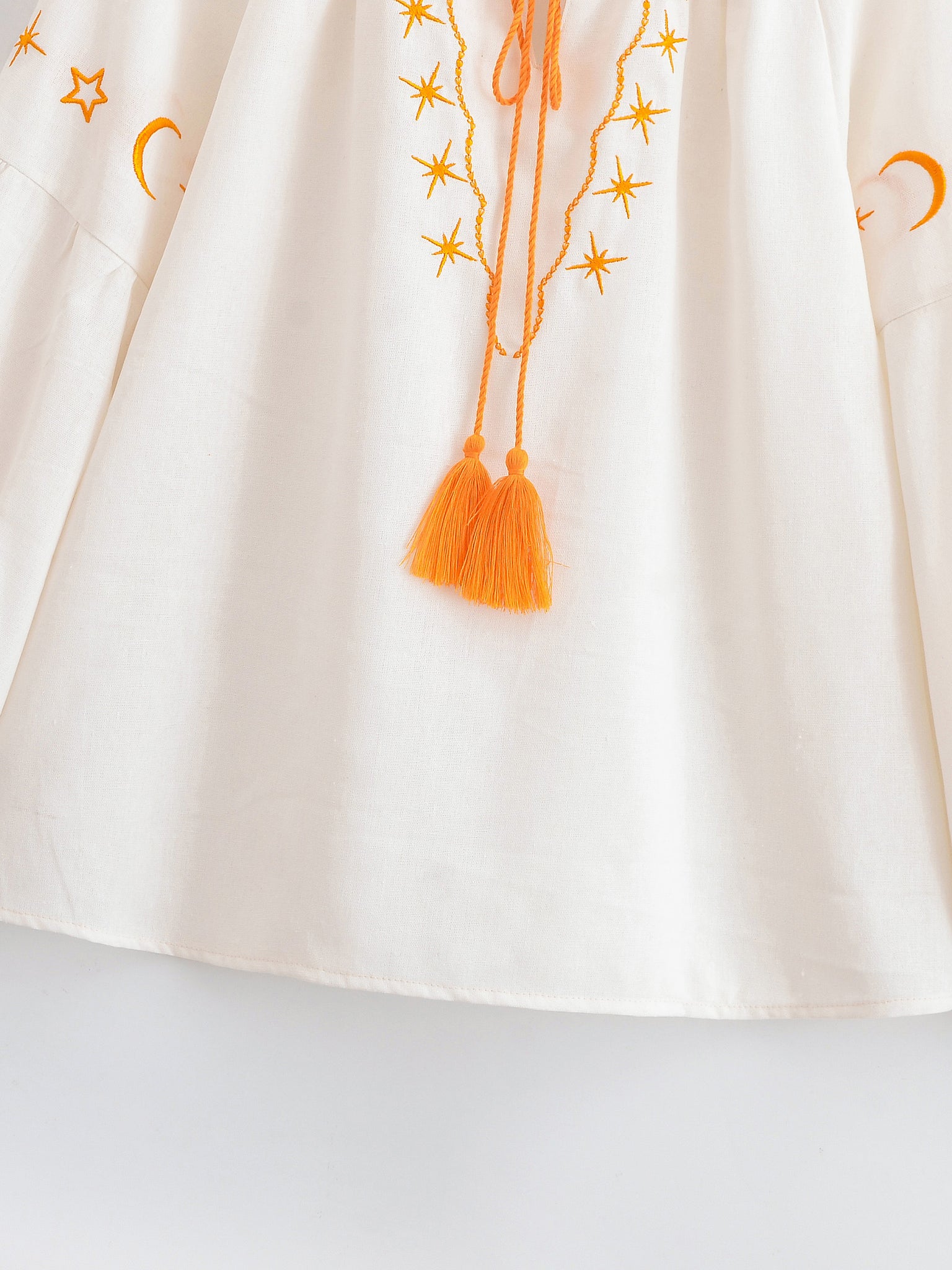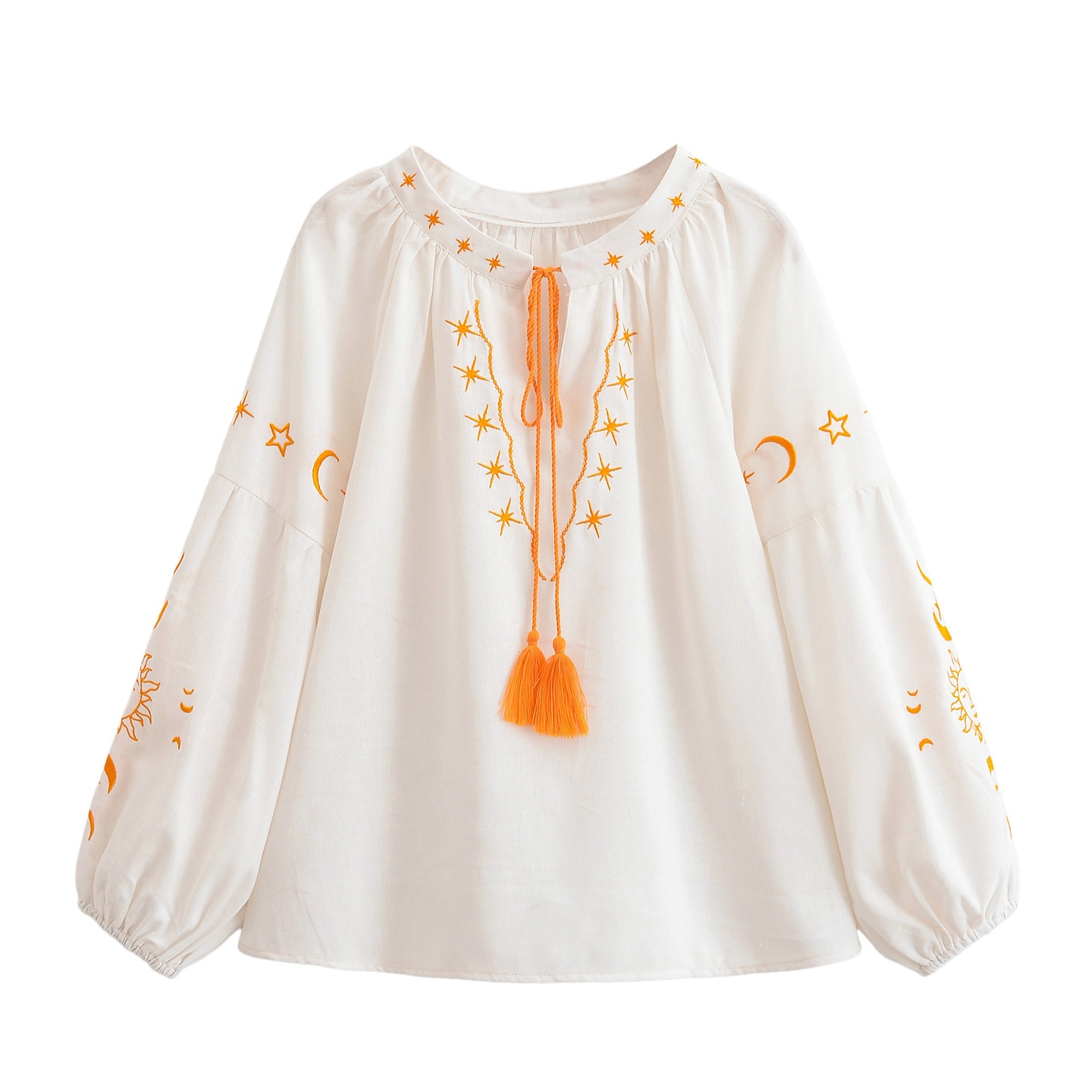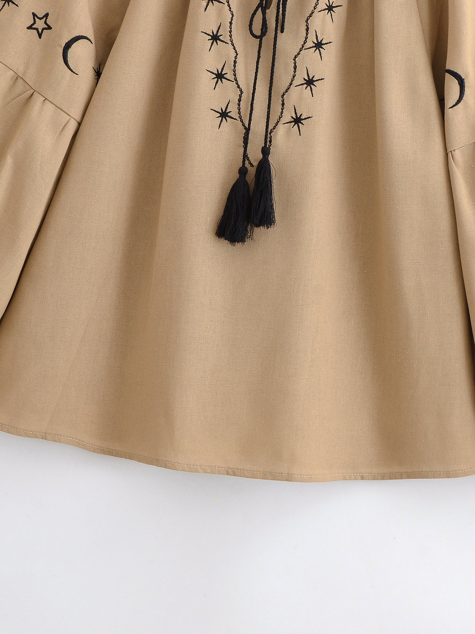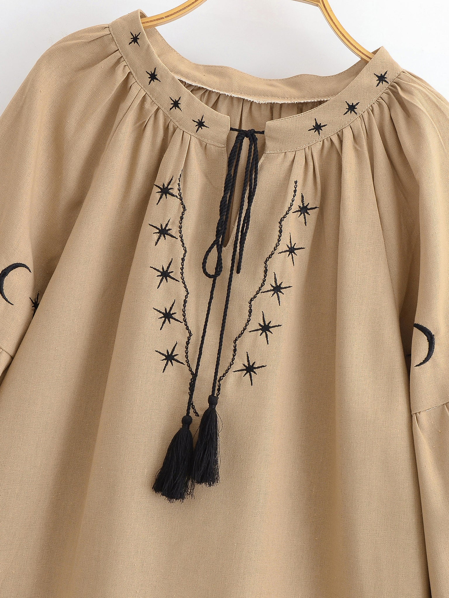 Star Moon Embroidery, Linen Cotton Blouse,Lace-up Tassel Boho Shirts