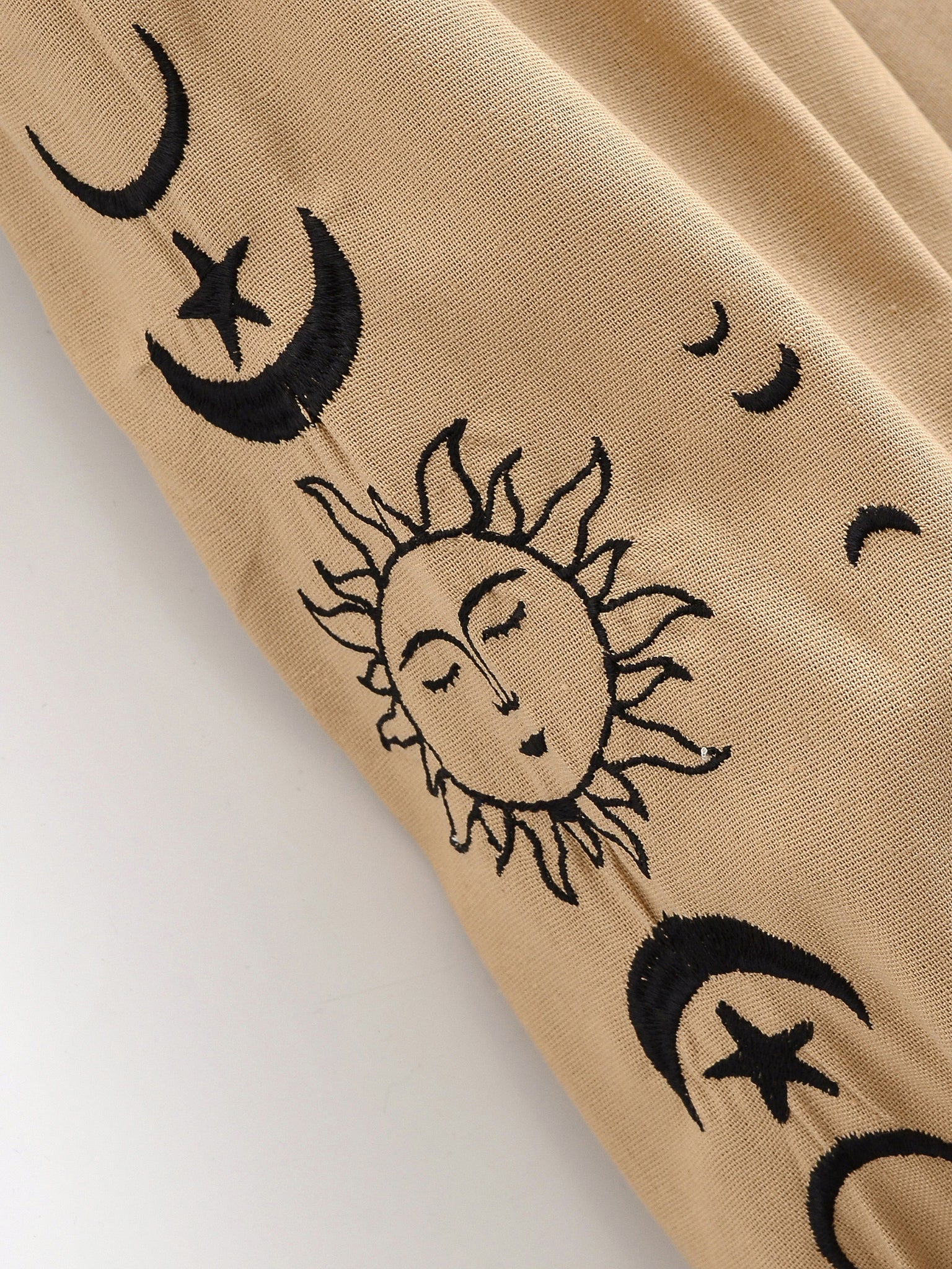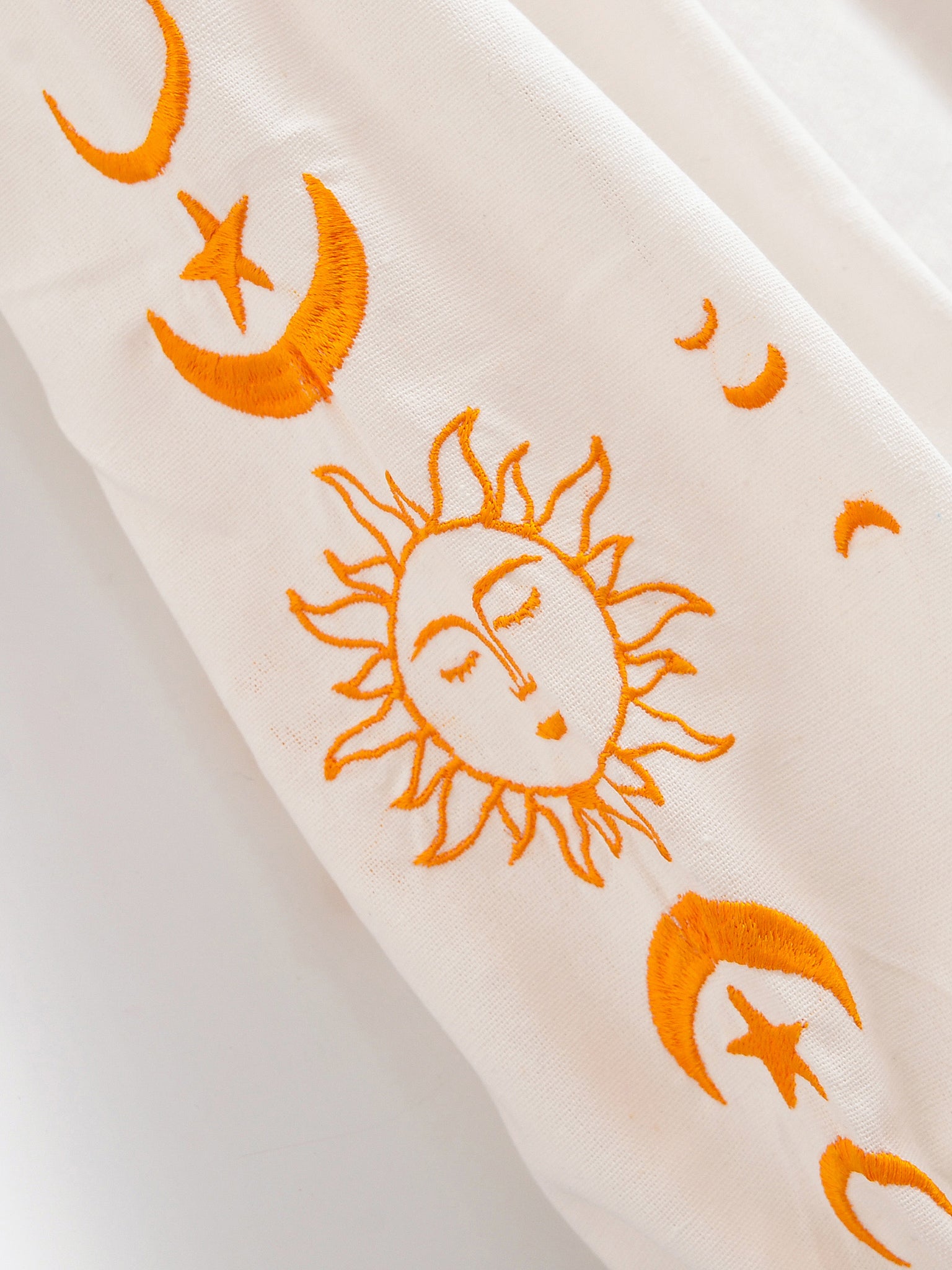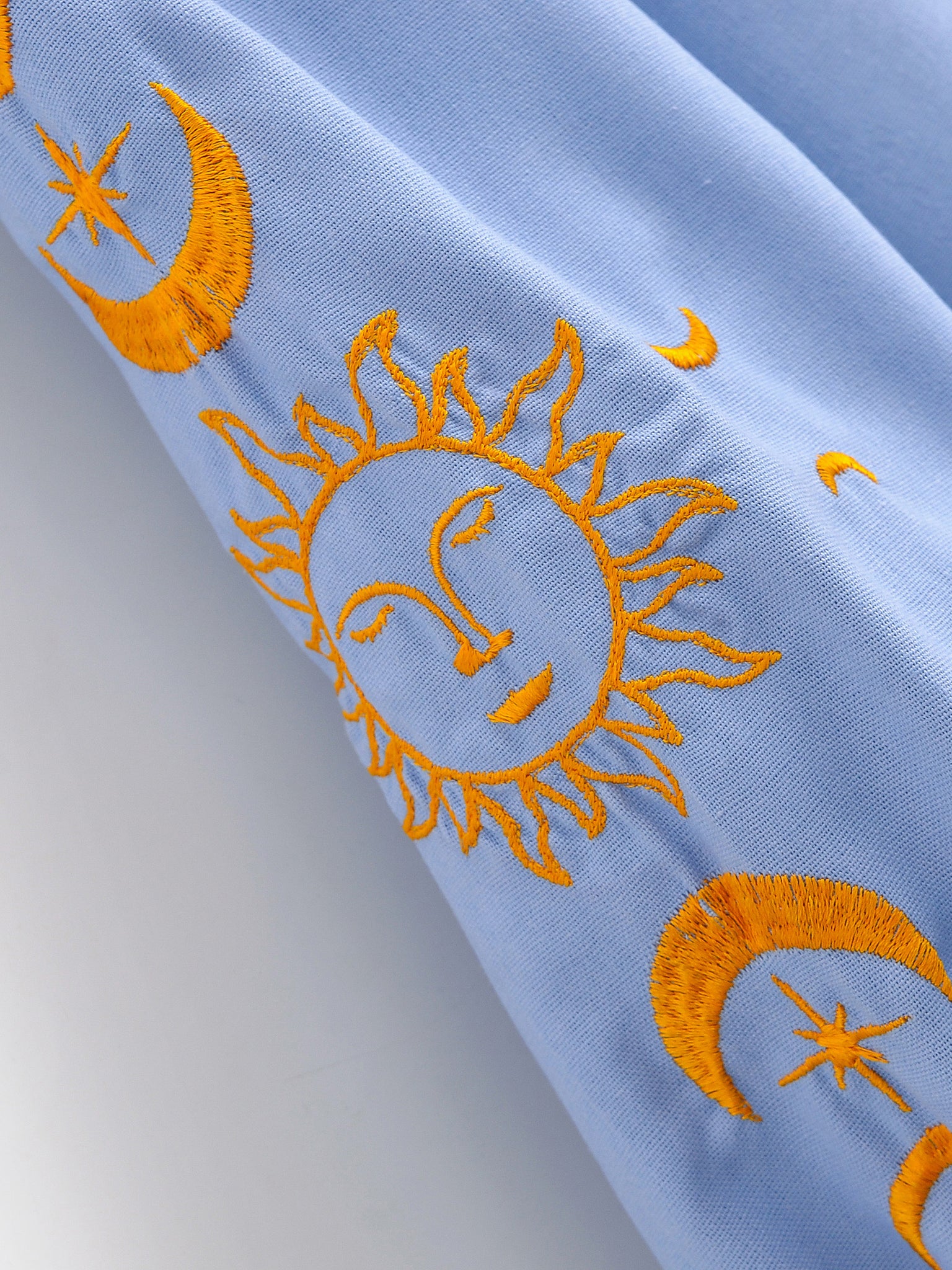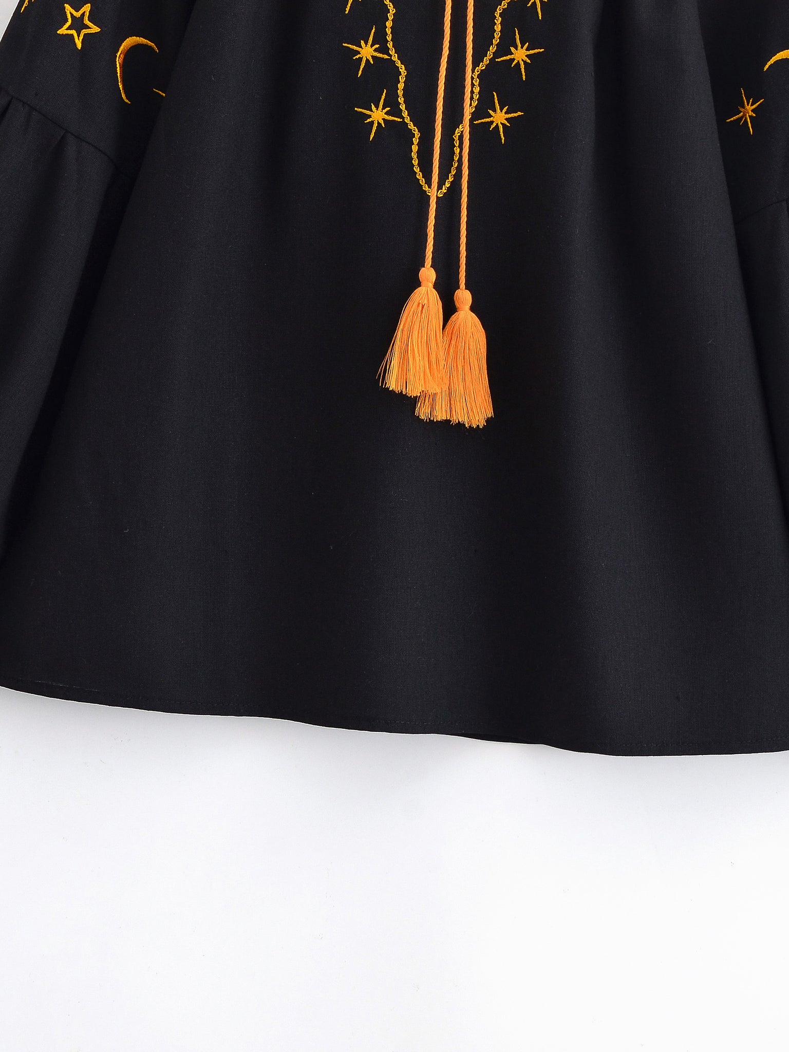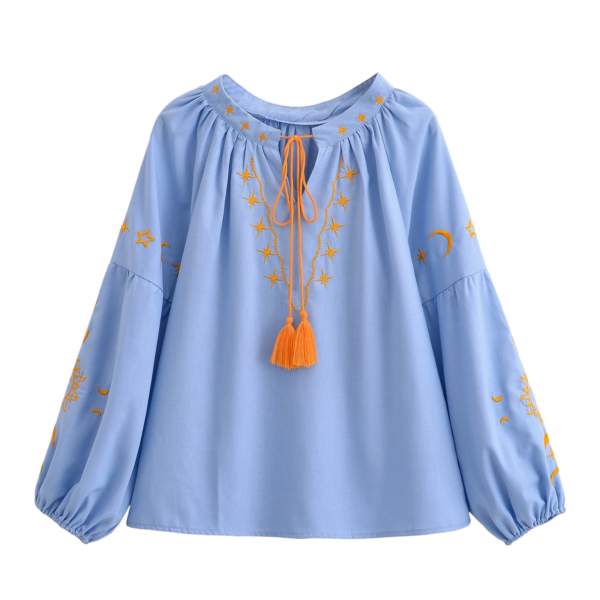 Star Moon Embroidery, Linen Cotton Blouse,Lace-up Tassel Boho Shirts